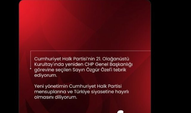 "Cumhuriyet Halk Partisi’nin 21. Olağanüstü Kurultay'ında yeniden CHP Genel Başkanlığı görevine seçilen Sayın Özgür Özel'i tebrik ediyorum. Yeni yönetimin Cumhuriyet Halk Partisi mensuplarına ve Türkiye siyasetine hayırlı olmasını diliyorum."