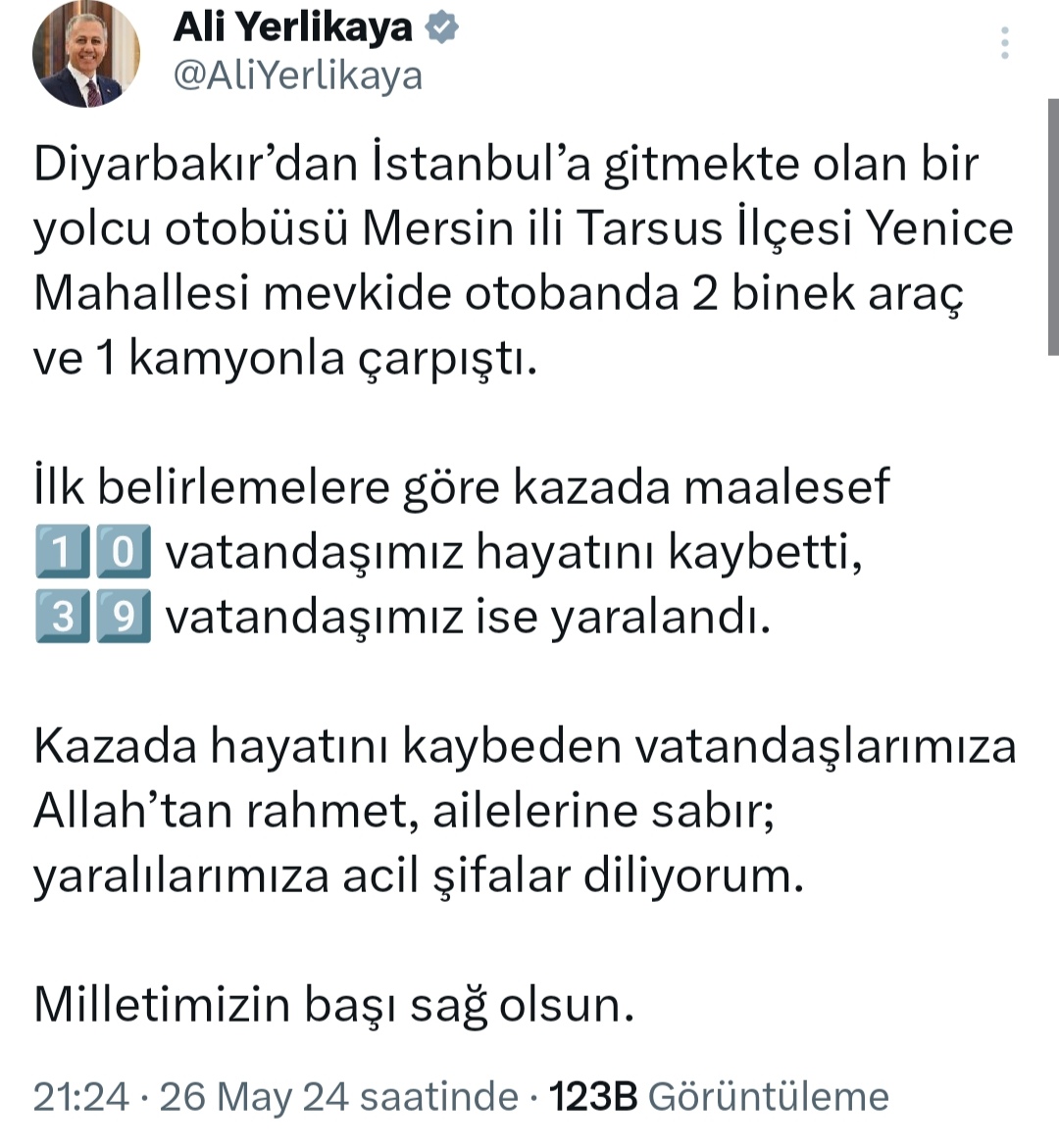 "Diyarbakır'dan İstanbul'a gitmekte olan bir yolcu otobüsü Mersin ili Tarsus İlçesi Yenice Mahallesi mevkide otobanda iki binek araç ve bir kamyonla çarpıştı. İlk belirlemelere göre kazada maalesef 10 vatandaşımız hayatını kaybetti, 39 vatandaşımız ise yaralandı. Kazada hayatını kaybeden vatandaşlarımıza Allah'tan rahmet, ailelerine sabır; yaralılarımıza acil şifalar diliyorum. Milletimizin başı sağ olsun."